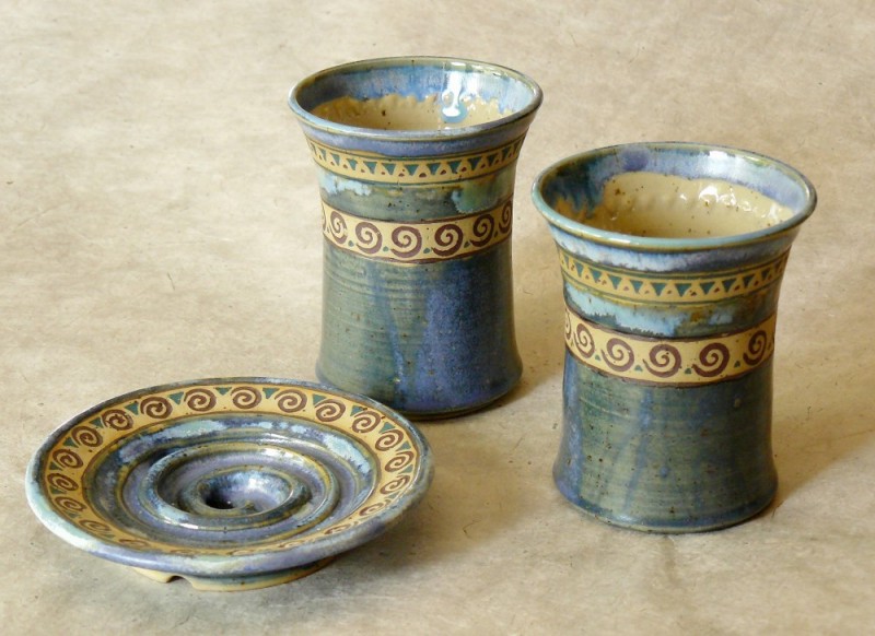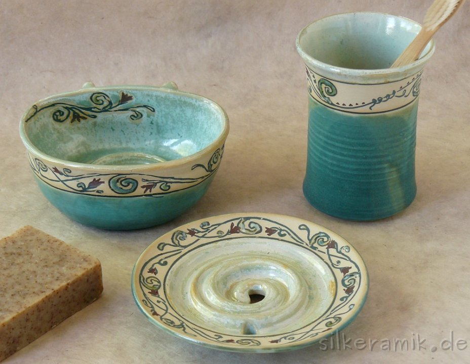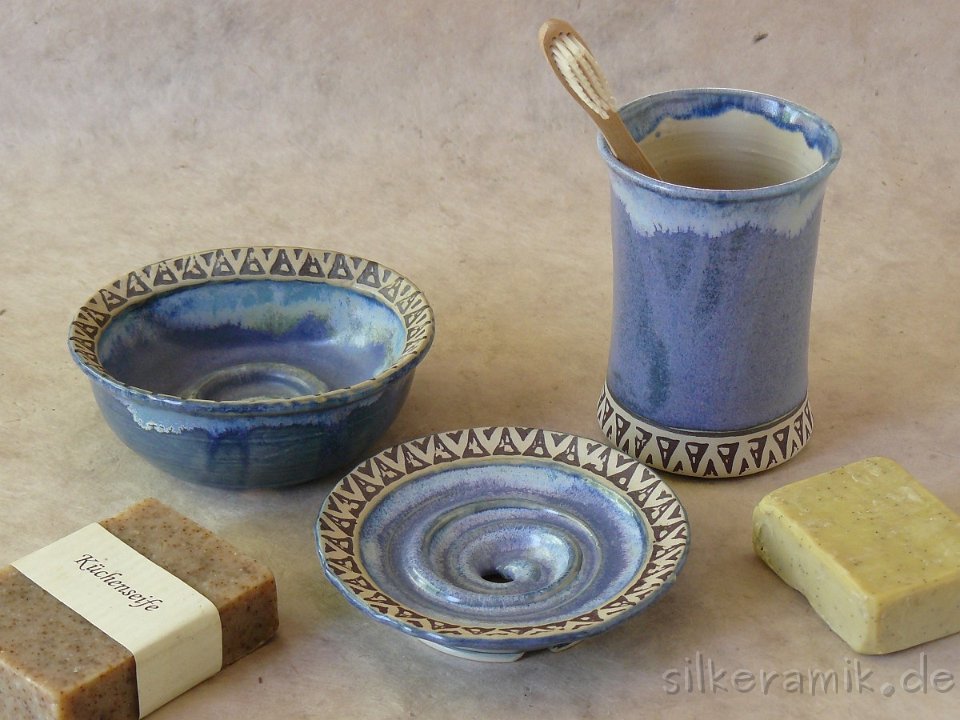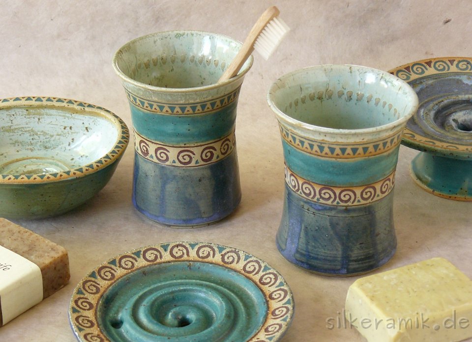 Keramik für das Badezimmer: Seifenschalen, Rasierschalen, Zahnputzbecher, Handtuchhalter und mehr.
