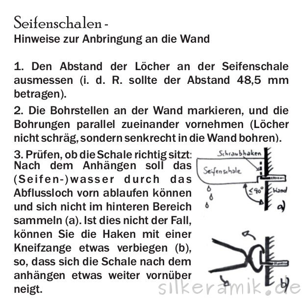 werden entweder auf zwei Schraubhaken gesteckt – so können sie leicht zum Reinigen abgenommen werden, oder im Falle der Fliesenseifenschalen angeschraubt oder eingeputzt.