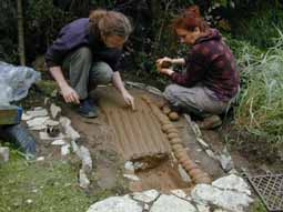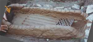 - 6. Bau der Feuerkammer: Ein Erdballen stützt das spätere Abzugsloch. Das Tretbrett einer alten Pfaff- Nähmaschine dient als Feuerrost.
