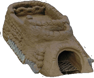 - Die Brennkammer, in der sich die rohen Tongefäße und -objekte befinden, liegt oberhalb des Feuerraumes. Durch den langen verschlungenen Flammenweg bleibt die Hitze länger im Ofen als bei einem Ofen mit direkt aufsteigender Flamme.