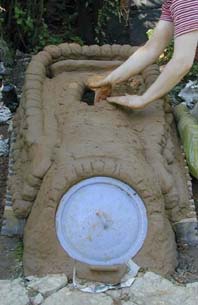 - 8. Der Boden der Brennkammer wurde geglättet, damit die Tonobjekte gut stehen können. Schornstein und Brennraumtür deuten sich bereits an. Da der Lehm zum Rumexperimentieren nur so einlädt, kommt schon mal so was wie die etwas verspielte Flammenbremse (hinten) zu Stande.