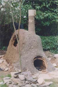 - 12. Auf die Strohlehm-Schichten wurde noch eine feine Sandlehm-Schicht aufgetragen. Rechts über der Brennraumtür: Ein Guckloch – verschlossen mit altem Teekannendeckel – zum beobachten der Brenntemperatur. Erste Brennprobe: Der Ofen zieht prima ! Jetzt braucht er nur noch ein richtiges Dach, denn Regen weicht den Lehm wieder auf. Fraglich ist auch, ob er den Winter übersteht …