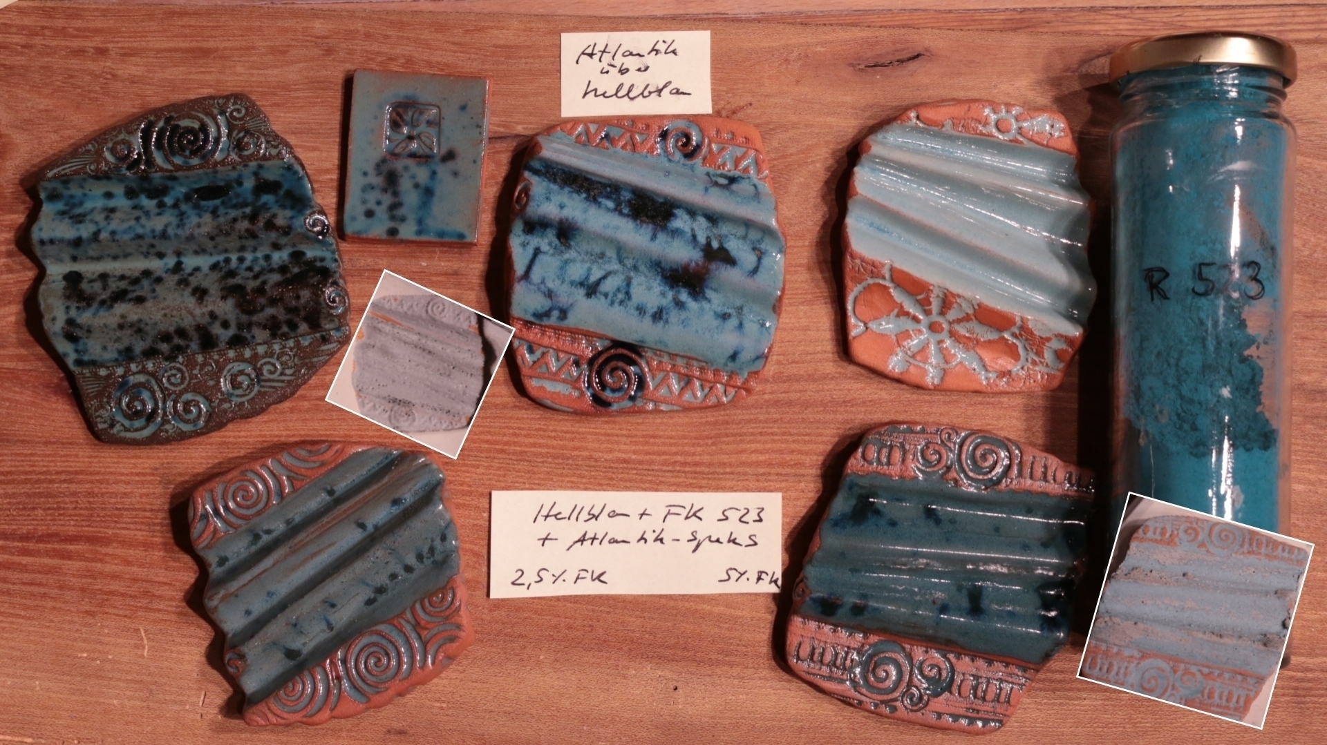 Auch Farbpigmente kommen dabei zum Einsatz, beispielsweise um der hellblauen Resteglasur etwas mehr Türkis zu verpassen. Dazu gibt es noch ein paar dunkelblau ausschmelzende Specks, die von einer anderen Glasur übrig geblieben sind.
