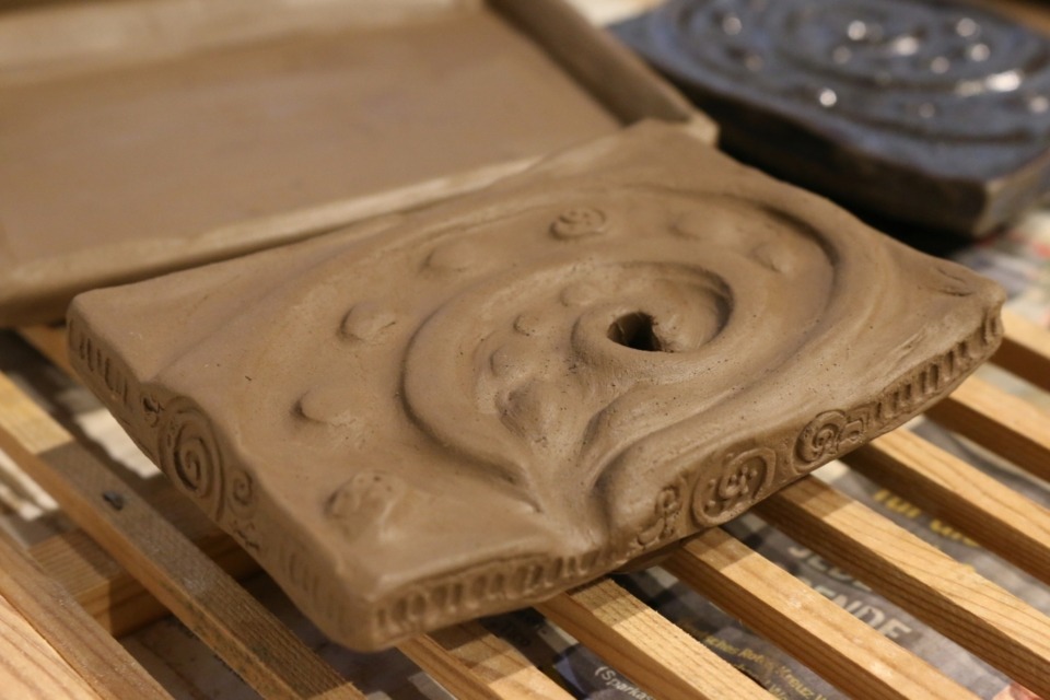 Mit diversen Techniken verzierte Badkeramiken aus hellem Steinzeugton – hoch und dicht gebrannt.