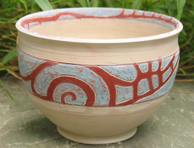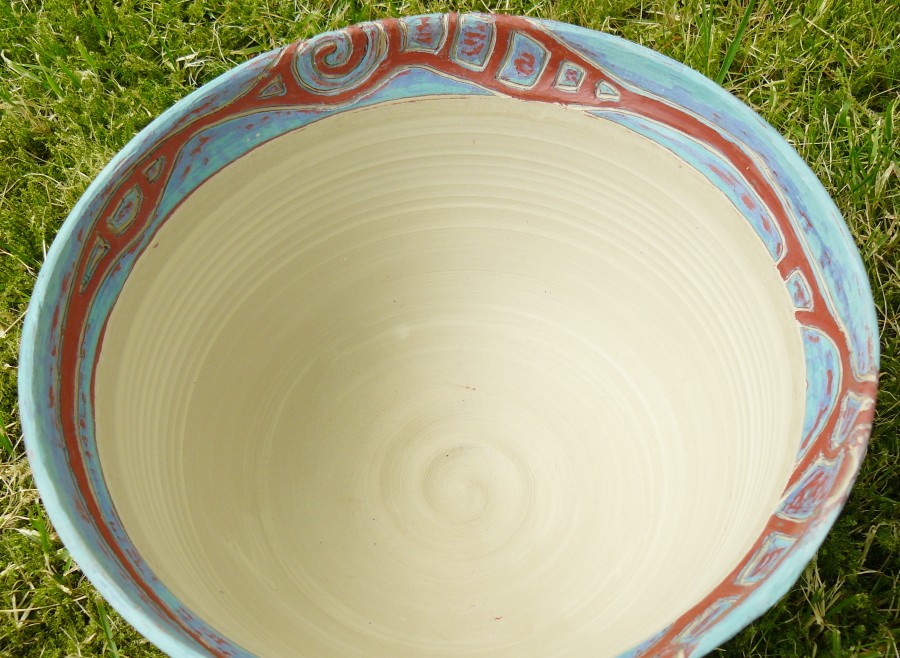Inspiriert von dem Keramik-Meister Kim Seong-Tae, habe ich heute den Rand einer Schale mt einer Sgraffito-Technik verziert, bei der ich zunächst 4 Schichten Engobe übereinander aufgetragen habe: rot, grün, blau, rot. (die letzten drei hätten gereicht). Das Muster (weiße Kontur) habe ich relativ frei in die Schichten geritzt – ein klassisches Silke-Design, das dieses Mal einfach frech über den Rand hinausläuft und im Nichts bzw. im später glasierten Schaleninnern verschwindet.