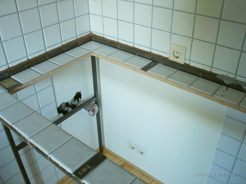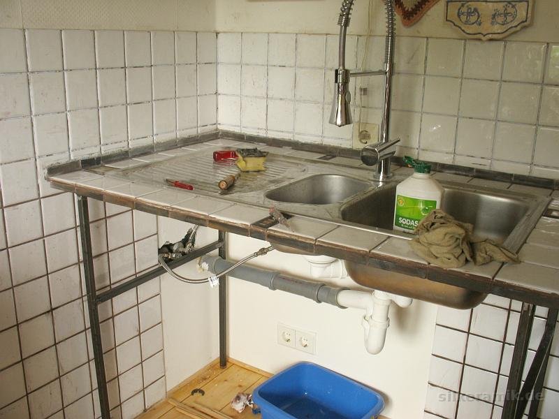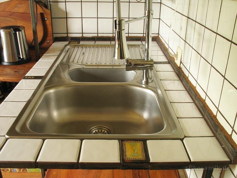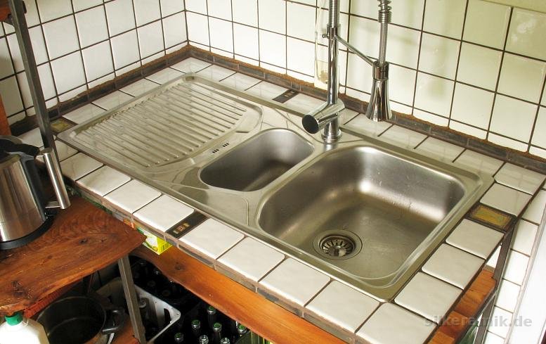 In diesem Beitrag beschreibe ich die Flieseneinfassung unserer Küchenspüle mit einer Einlage aus Schmuckfliesen (auch wenn die Aktion schon ein paar Jahre zurück liegt). Dank der Zusammenarbeit mit einem befreundeten Tischler, dank meiner ersten erfolgreichen Elektro-Schweißexperimente sowie dem Erwerb einer gebrauchten Edelstahl-Spüle und einigen passenden Fliesen, die ich in unserem Schuppen fand, konnte dieses Projekt erfolgreich durchgezogen werden – ohne Fliesenschneider. Deshalb ist es aber noch lange keine Spülenumrandung für Faule, denn statt des Schneidegerätes waren Rechen- und Töpferkünste gefragt.