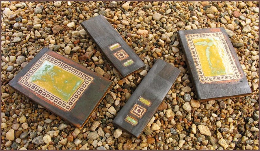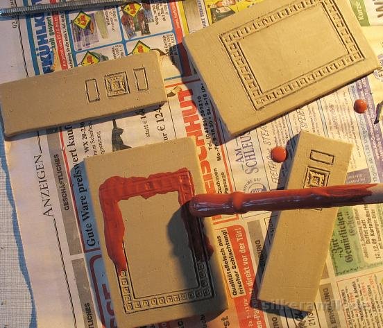 Bei der Verzierung entschied ich mich für die Intarsientechnik, die ich auch bei meinen Gefäßkeramiken gern nutze. Dabei ist zu bedenken, dass die Linien und Muster umso gröber ausfallen, je stärker die Schamottierung des Tons ist (sie eignet sich für grob schamottierte Kacheln folglich nicht so gut).