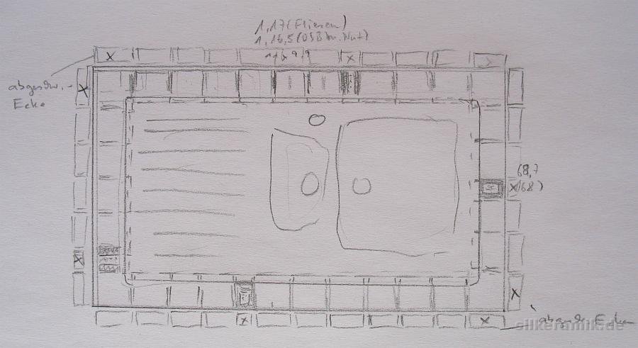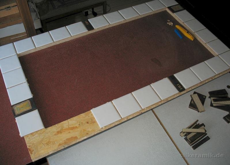 In meiner Werkstatt habe ich berechnet, wie groß die Lücken zwischen den weißen Keramik-Fliesen sein würden und wie groß somit die Schmuckfliesen und auch die Randabschlussfliesen ausfallen müssen (siehe Zeichnung Bild 2). Dabei galt es auch, die Schrumpfung des Tones von ca. 11% nach dem Glasurbrand zu berücksichtigen. Es folgte die Anfertigung passender Kacheln.