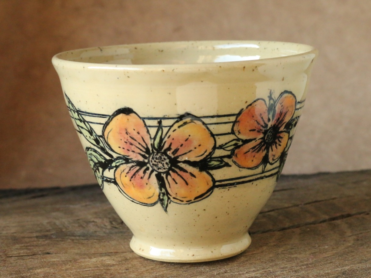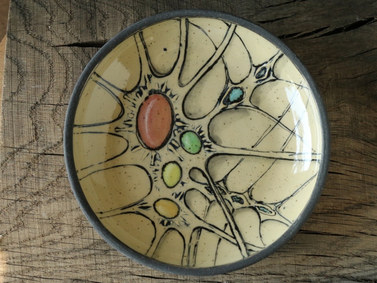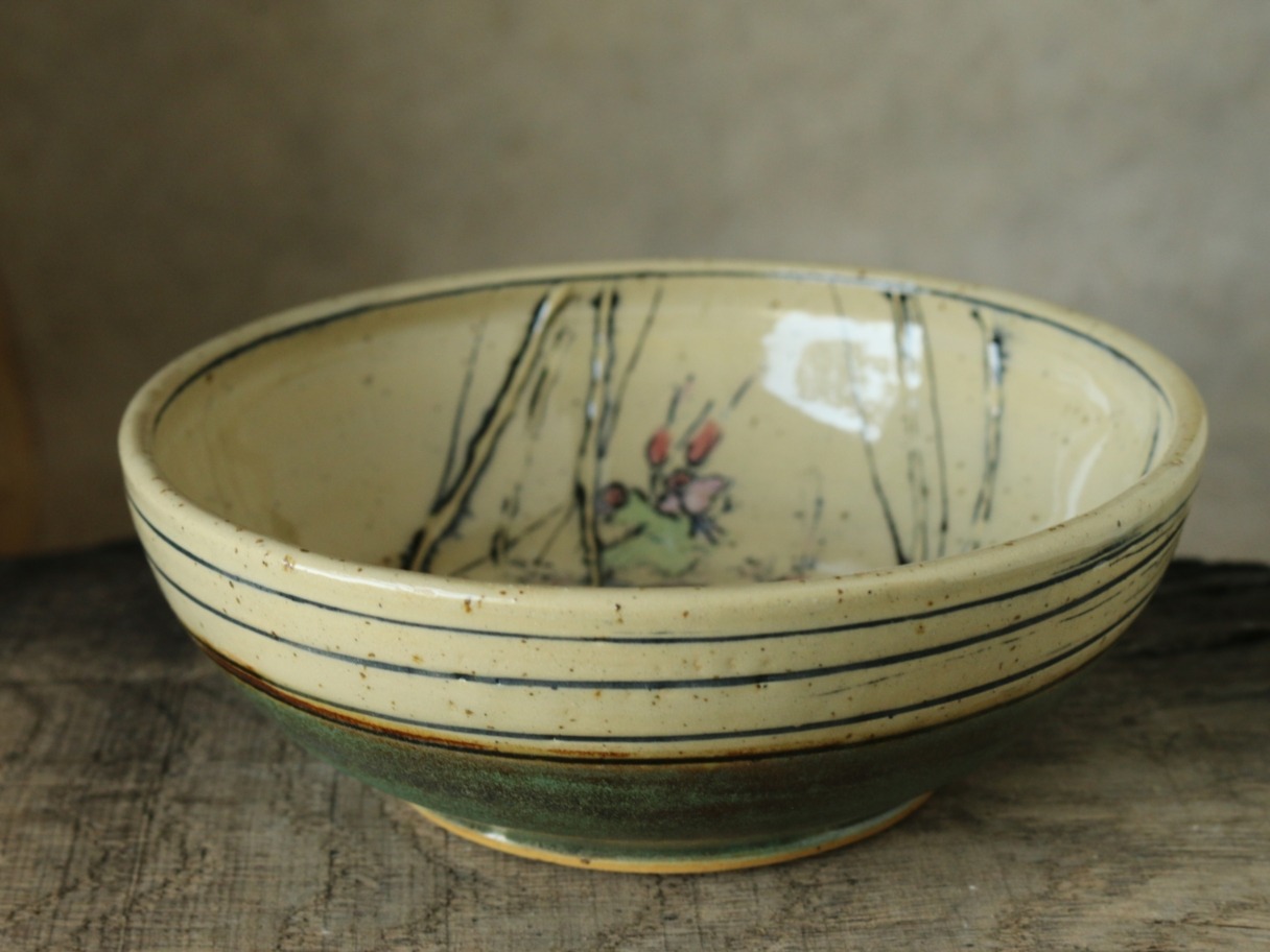 Mit diversen Techniken verzierte Badkeramiken aus hellem Steinzeugton – hoch und dicht gebrannt.