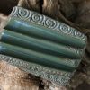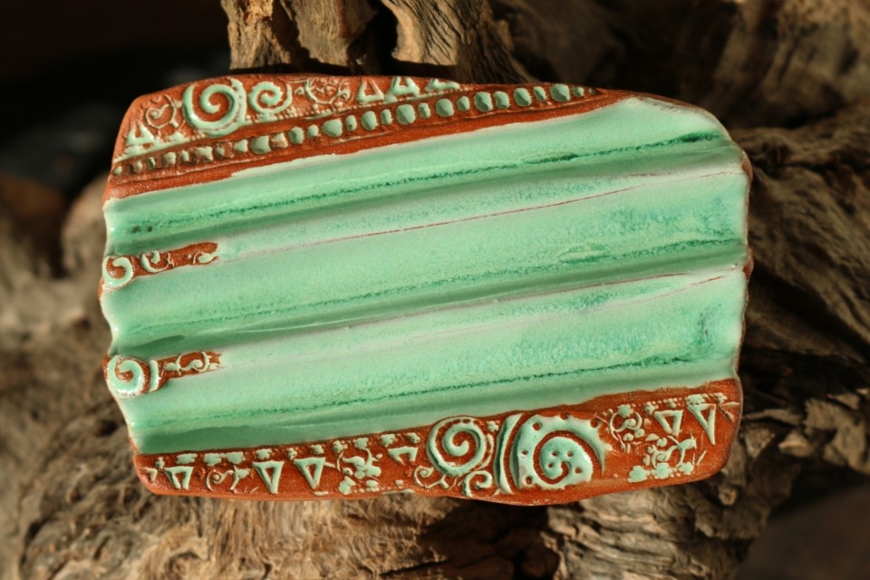 Effektive Seifenablagen aus farbigen Tonen, die mit Stempelmustern verziert wurden.